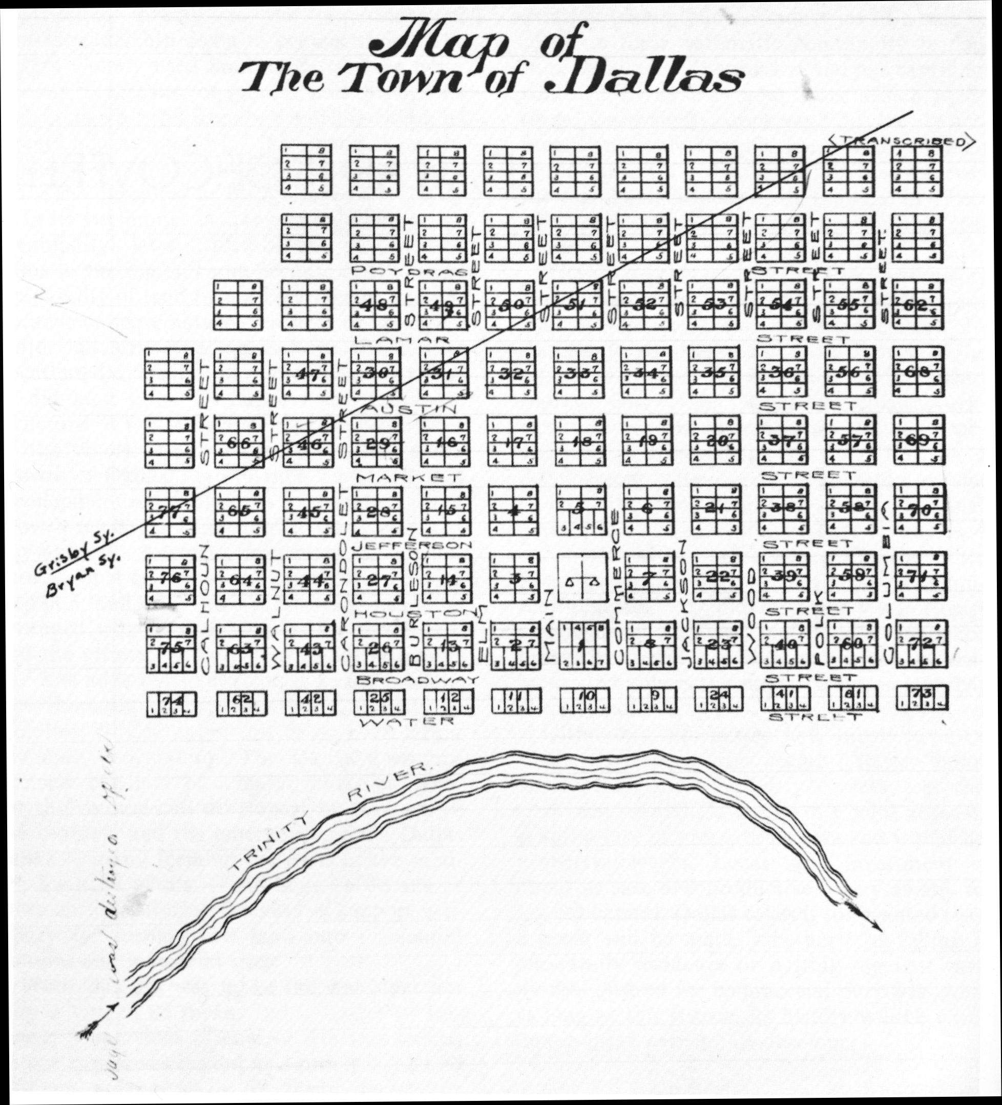 The juxtaposition of the Bryan and Grigsby grids is easily seen on this map. Note that the orientation of the map is North (left), East (top), South (right), and West (bottom). This map is located in the Dallas County Records, Deed Book D, page 688.
